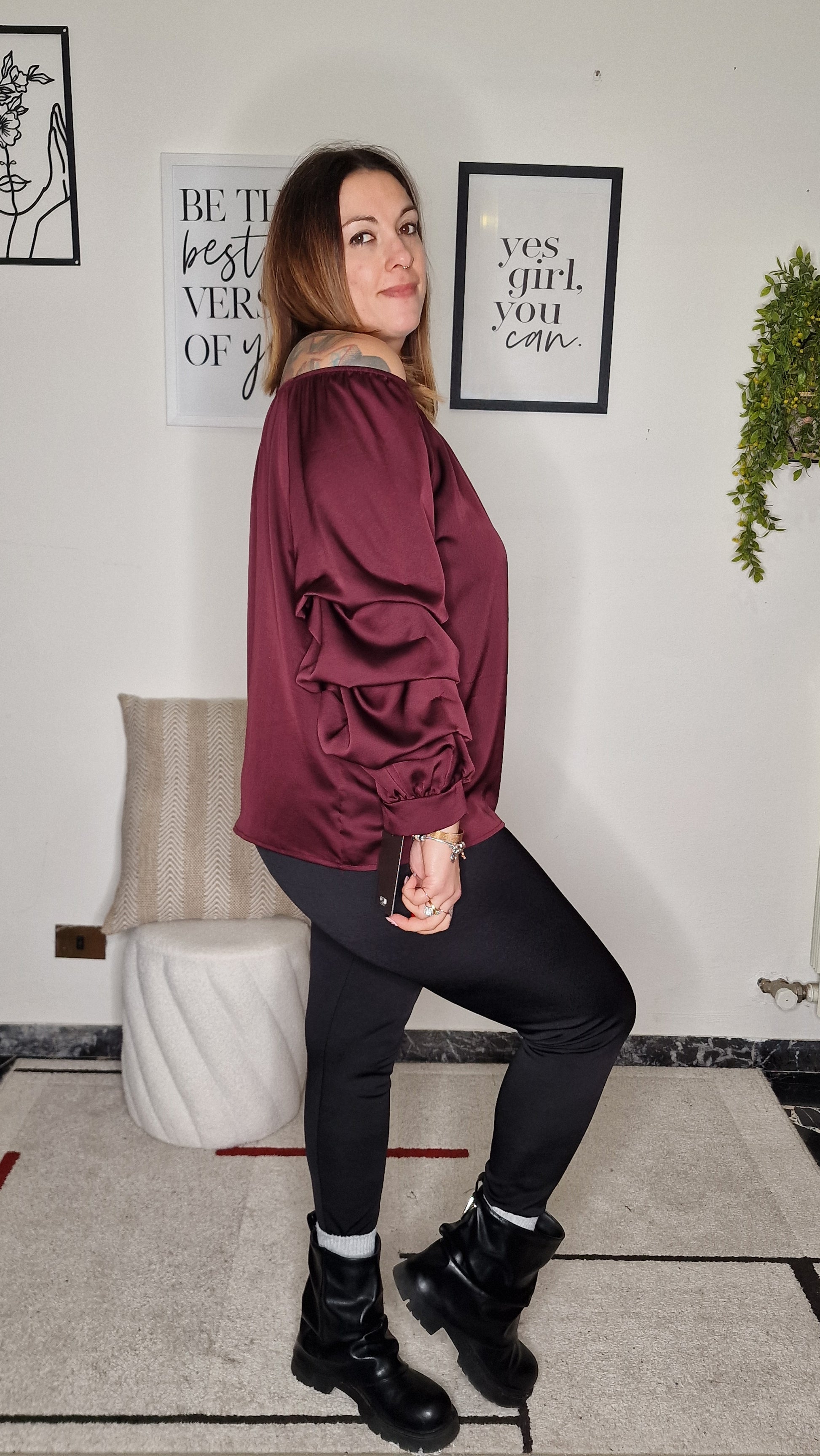 Questa elegante blusa unisce il fascino della linea a spalle scoperte (o scollo Bardot) al lusso discreto del tessuto effetto seta. Le maniche lunghe sono rifinite con un drappeggio morbido e leggermente arricciato, aggiungendo volume e movimento. Il taglio oversize e scivolato garantisce una vestibilità ultra comoda e fluida, rendendola perfetta per eventi serali o occasioni speciali.