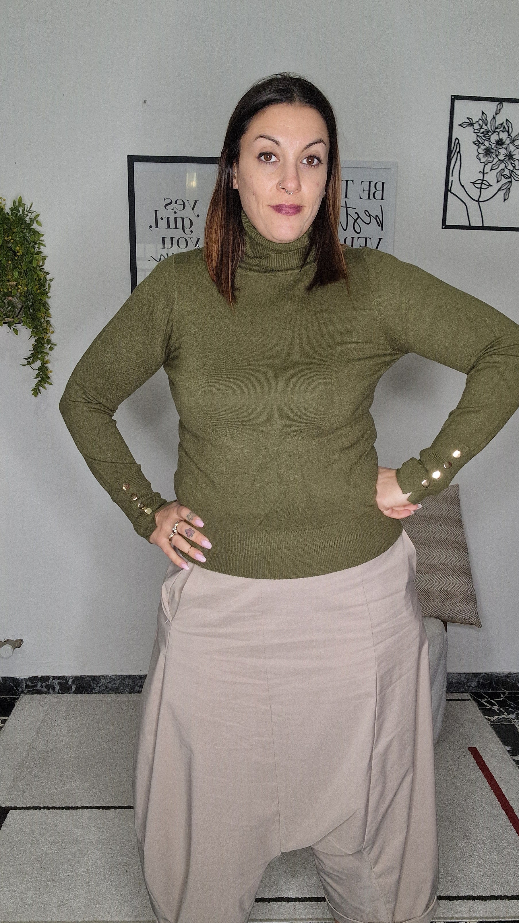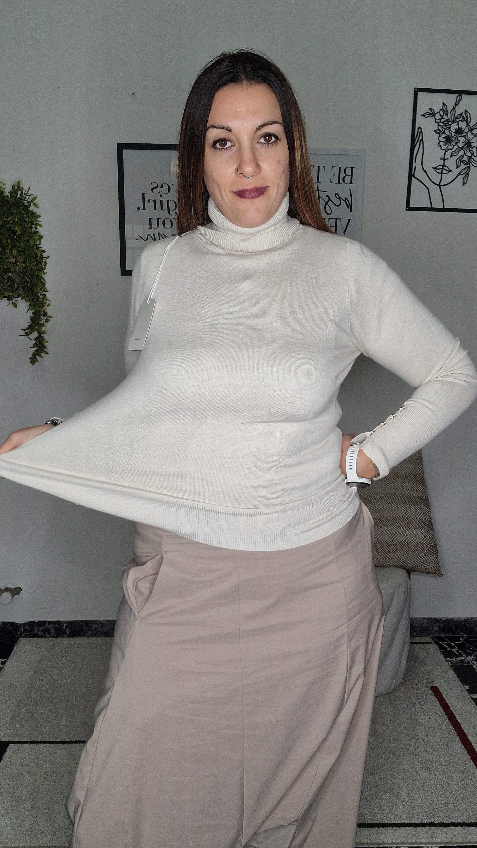 Il collo a lupetto (o dolcevita) ti protegge con stile, mentre il dettaglio sui polsini aggiunge un elemento distintivo: una fila di finti bottoni dorati che catturano la luce e trasformano un capo base in un pezzo chic. Perfetto da indossare da solo o come base sotto blazer e cardigan oversize.
