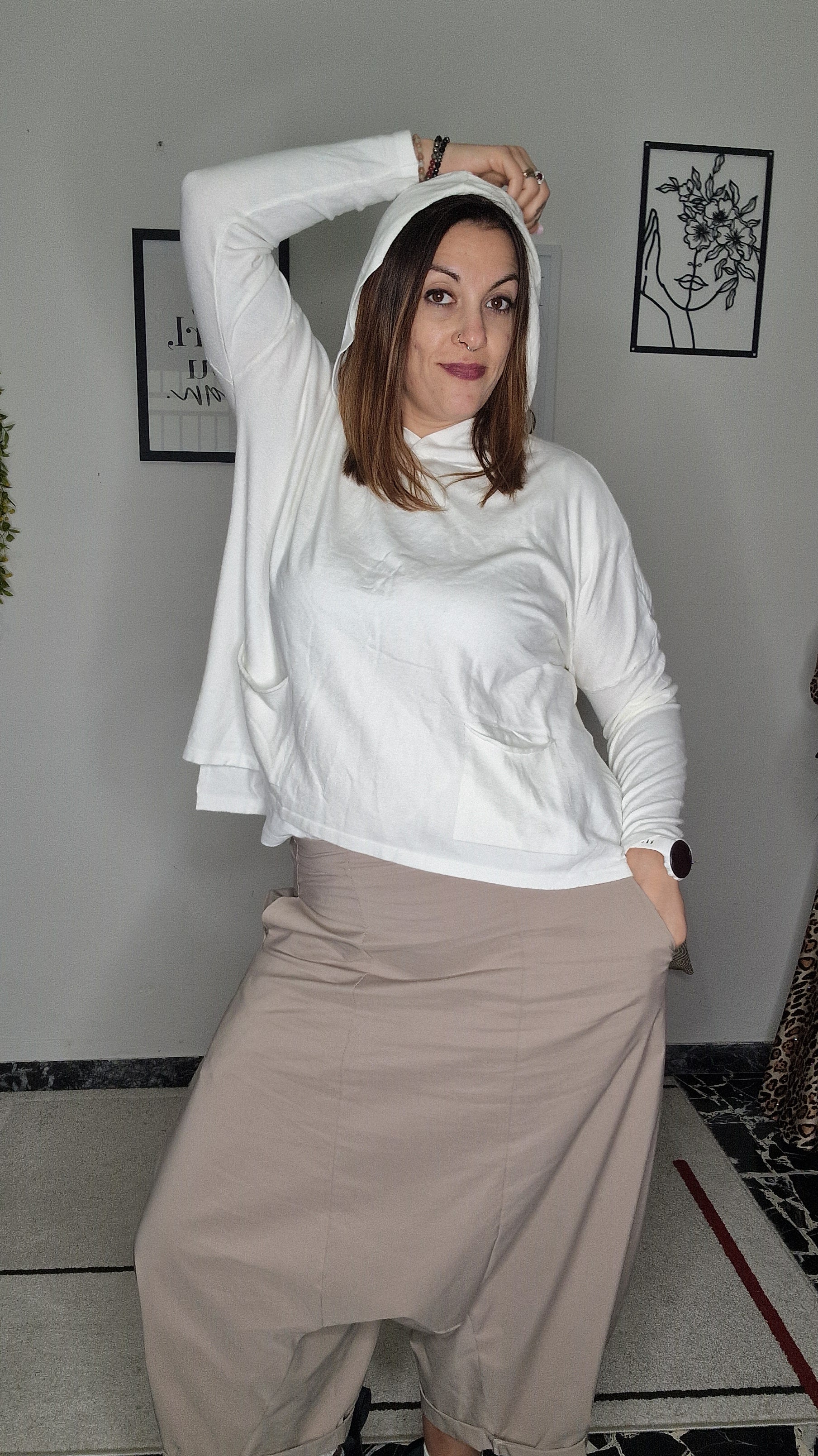 Ciò che la rende un must-have è la sua incredibile elasticità e la vestibilità oversize studiata per adattarsi a ogni silhouette con grazia. Dotata di un pratico cappuccio e di due comode taschine frontali (tipo marsupio), è perfetta per i tuoi momenti di relax o per un look dinamico e disinvolto.