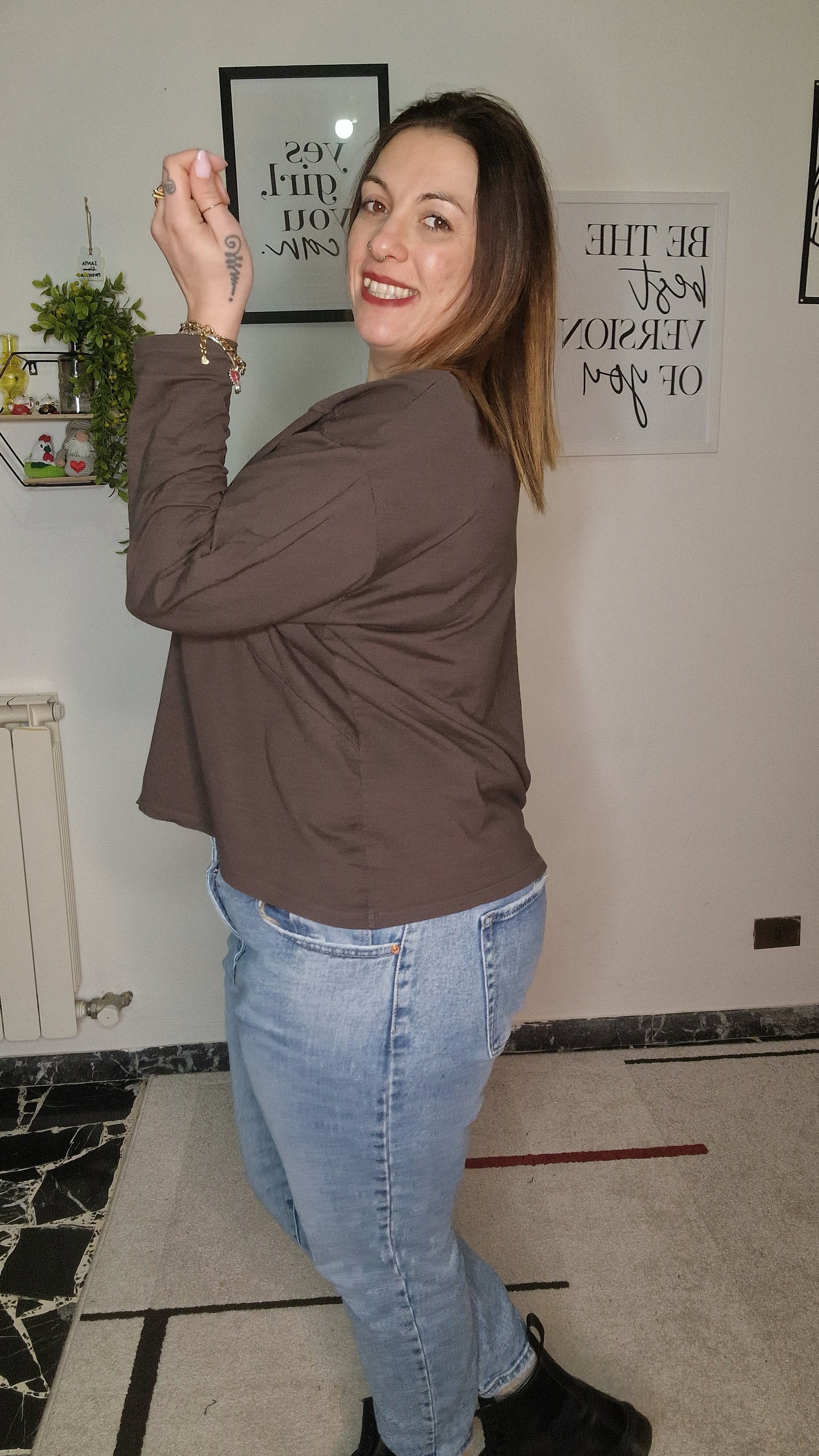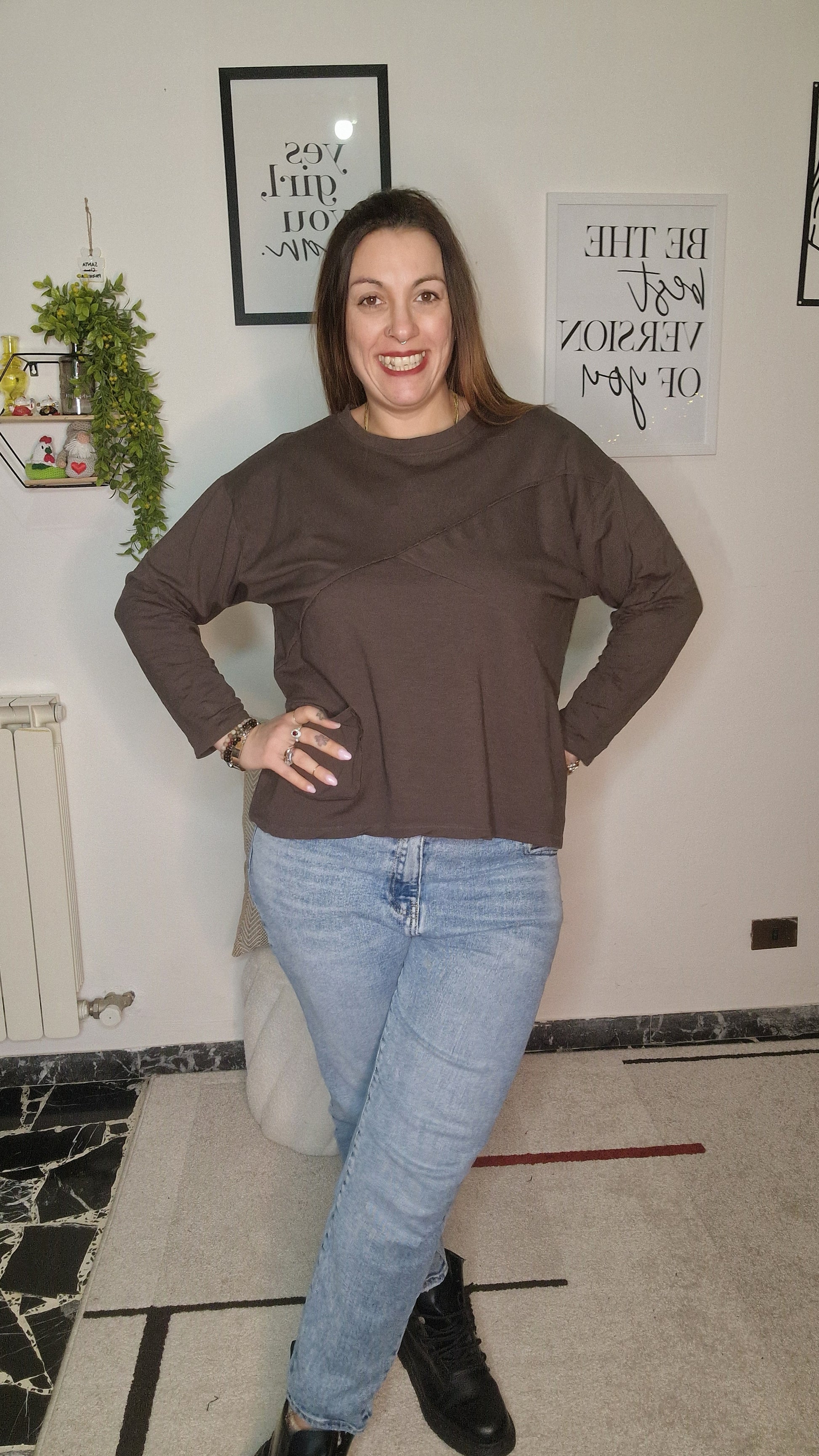 Indossa la variante Cioccolato con un denim chiaro per un contrasto cromatico moderno, oppure abbinala a un pantalone panna per un look tono su tono molto raffinato. Grazie alla sua composizione in cotone, è la maglia ideale per i momenti di relax o per un look da ufficio dinamico, perfetta da indossare sotto uno dei nostri spolverini della collezione.