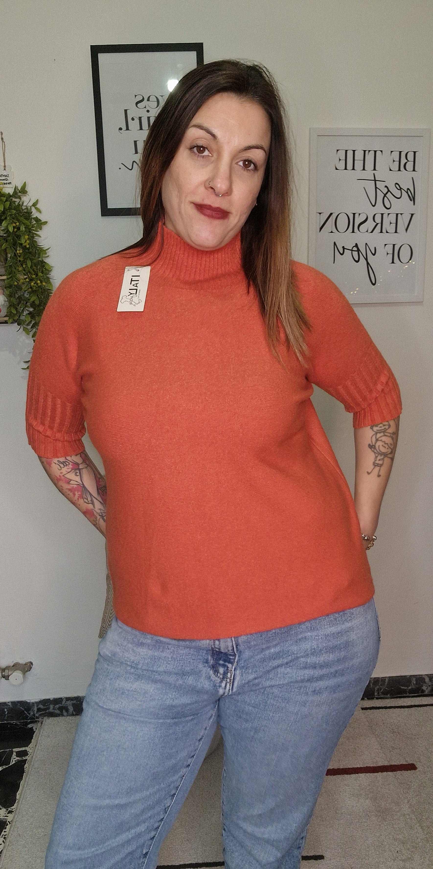 Indossa la versione Arancio con un denim chiaro a vita alta per un look solare e contemporaneo. La Maglia Lupin è perfetta anche come sottogiacca per i nostri blazer "Elettra" o "Frida", aggiungendo un tocco di colore sobrio ma deciso. Il design con manica corta la rende ideale per la transizione tra le stagioni o per gli ambienti riscaldati.