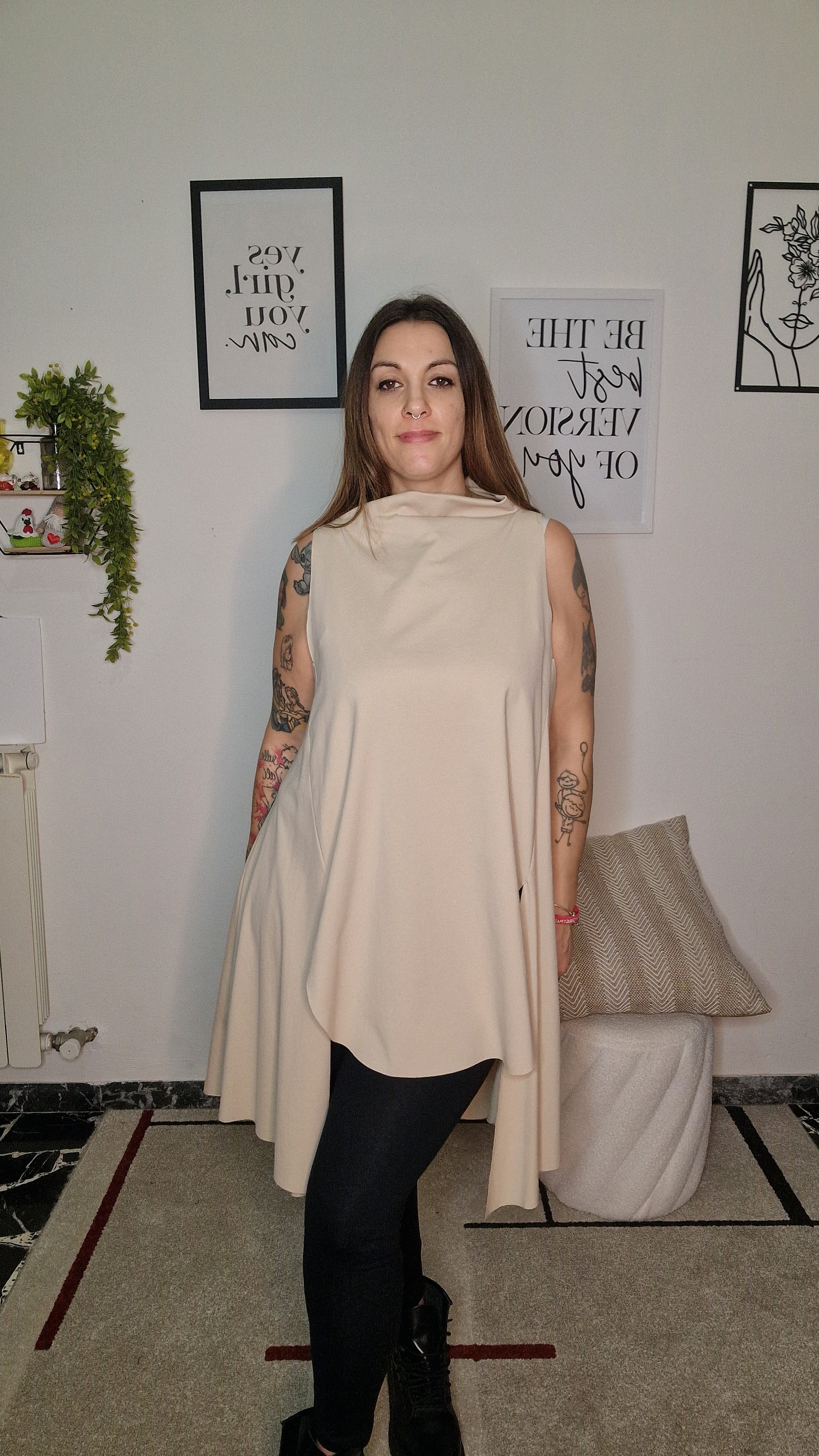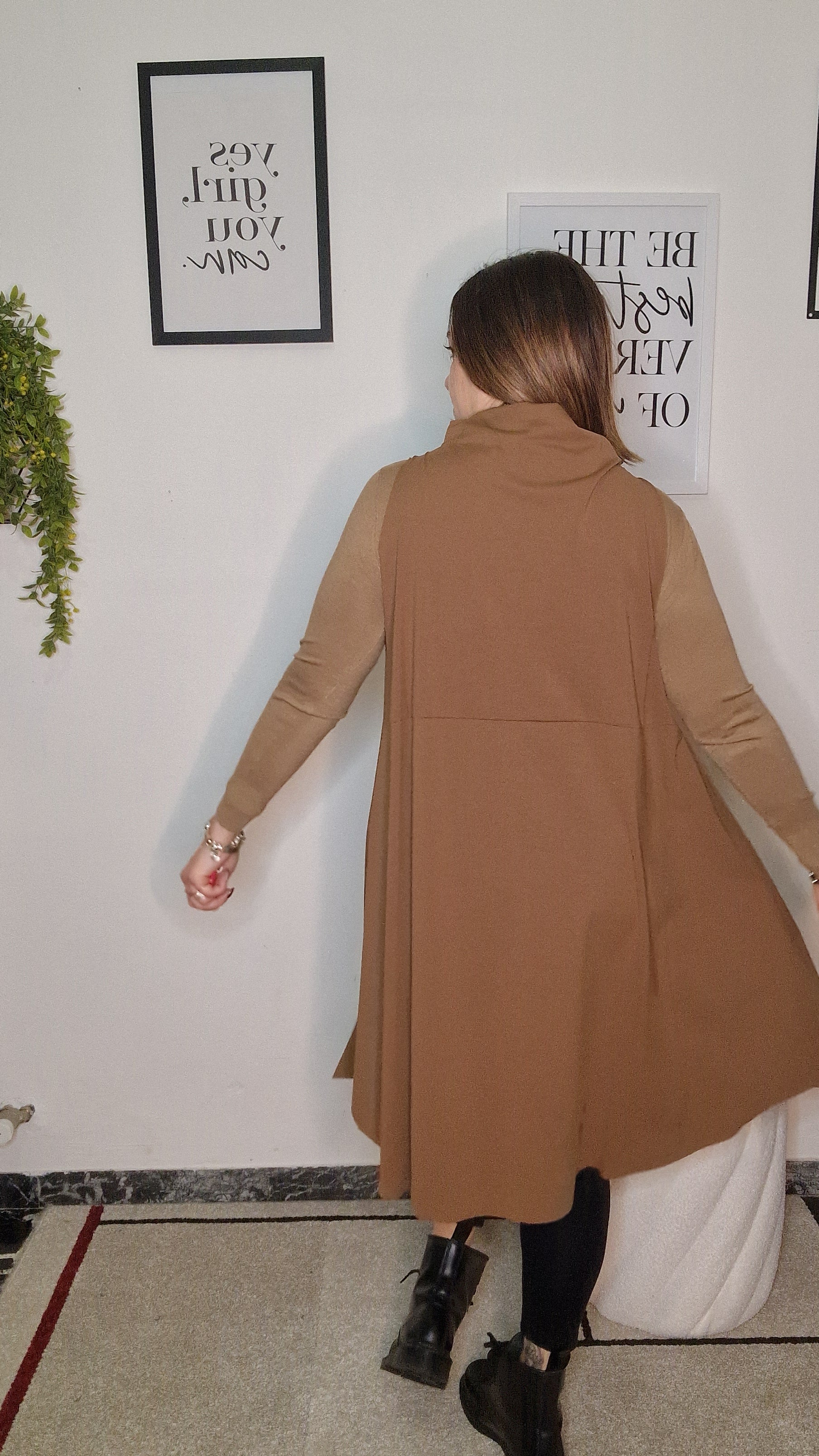 Il collo alto e morbido a ciambella aggiunge una nota di sofisticata protezione, mentre l'assenza di maniche la rende il capo perfetto per il layering creativo: indossala da sola o sopra un dolcevita sottile per un gioco di sovrapposizioni impeccabile.