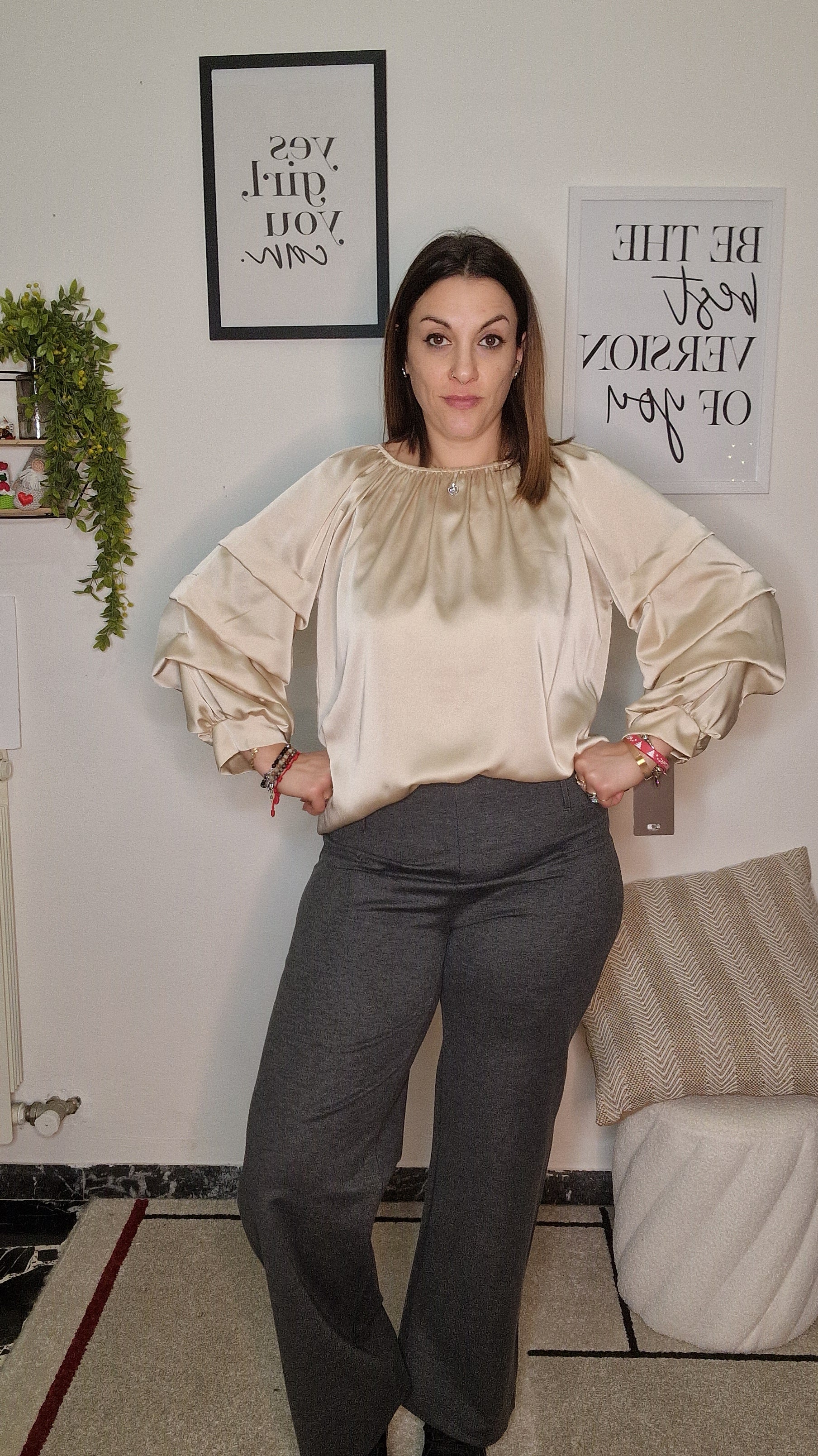 Chic Evening: Come mostrato in foto, abbinalo a una blusa in raso color champagne con maniche a sbuffo per un contrasto di texture raffinato e luminoso.