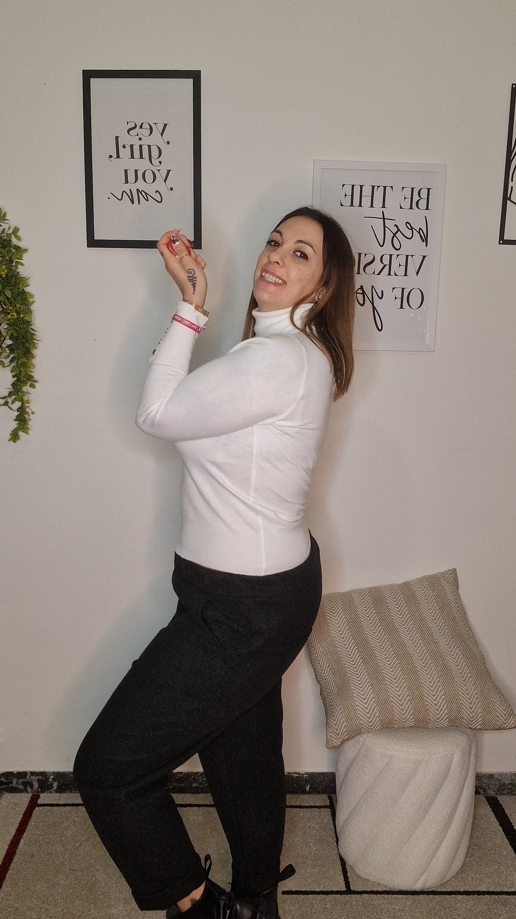 Total Comfy Look: Indossalo con il nostro dolcevita bianco e la giacca coordinata (come mostrato in foto) per un set armonioso nei toni del sabbia e del panna.